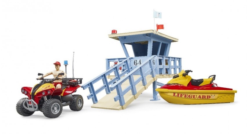 Relaxation and sport on and in the water is very important at BRUDER in the themed world of leisure. The safety of all bworld water sports enthusiasts is ensured by the bworld lifeguard and his station. His task is to recognize, understand and act in hazardous situations on and in the water. The lifeguard station is equipped with the new rotating beacon for signalling hazardous situations. The new lifeguard quad is available for rapid access to seaside locations. The lifeguard uses the water craft for water deployment. The bworld lifeguard with stand-up paddle (SUP) (item no. 62785) and the RAM Power Wagon in lifeguard version with figure and SUP (item no. 02506) are also available from BRUDER and make a perfect addition to the Life Guard Station.