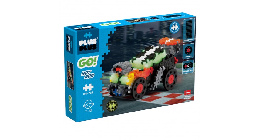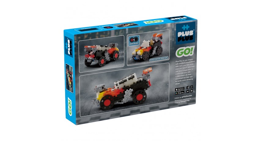 With GO!, you can build a car, race it, and then use your imagination to customize your ride. The GO! Hot Rod includes 240 pieces in 10 different colors, 4 wheels, and 1 chassis baseplate along with instructions to create a Hot Rod. Once you assemble, download our free app for even more building ideas. Plus-Plus is made in Denmark in our own zero-plastic-waste factory powered by renewable energy.