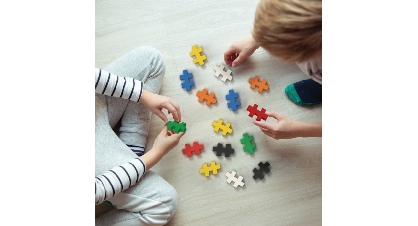 Plus-Plus BIG Travel Case contains 15 BIG pieces. It has a durable fabric exterior over a flexible but rugged case with a convenient carry handle.