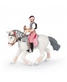 White dress pony with a beautiful pink saddle, ready to go for a ride with his young...