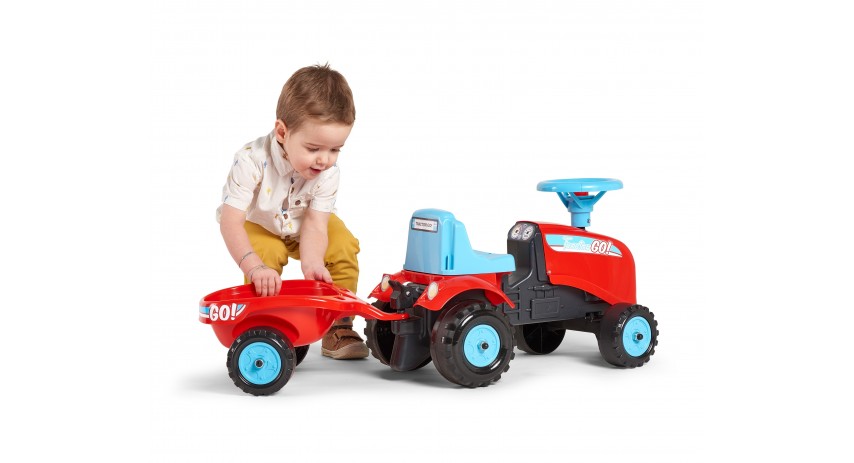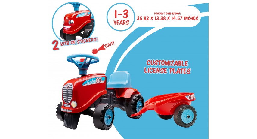 • Go! Ride-on and push-along tractor, equipped with adirectional steering wheel, horn, mini trailer and an additional sticker kit included for a little cute face free shipping |