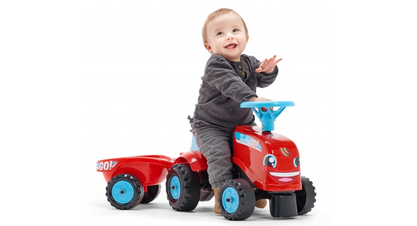 Falk reinvents its ride-on tractor, 100% made in France for toddlers from 1 year old. Even more fun with its rounded contours and mischievous smile, it will delight little gardeners. Its bright colours are ideal to stimulate baby, who will also be able to develop his or her motoring skills and balance while having fun! As much at home in the garden as indoors thanks to its steering wheel and horn, this charming little tractor and trailer will be your toddler's favourite way to transport their cuddly toys from the bedroom to the lounge or outdoors. And for those who prefer a tractor with a vintage look, an extra sticker kit is included that enables toddlers to personalise their favourite toys as they please!