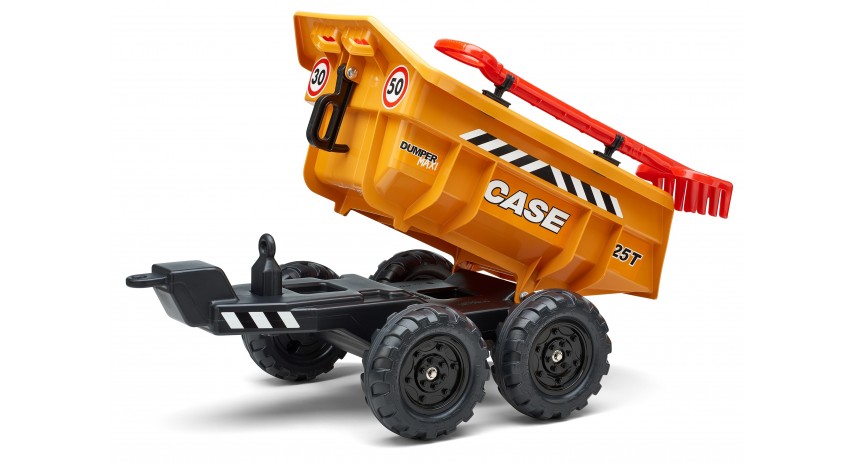 Maxi Case CE tilt trailer equipped with 4 all-terrain wheels and delivered with shovel and rake. Adaptable to the entire range of Falk tractors for 3 to 7 years old - 100% made in France.