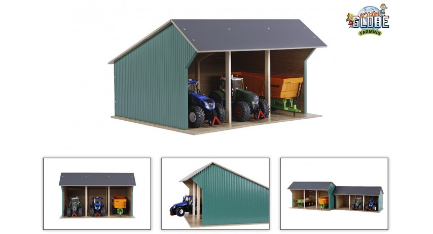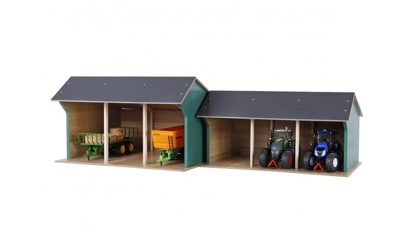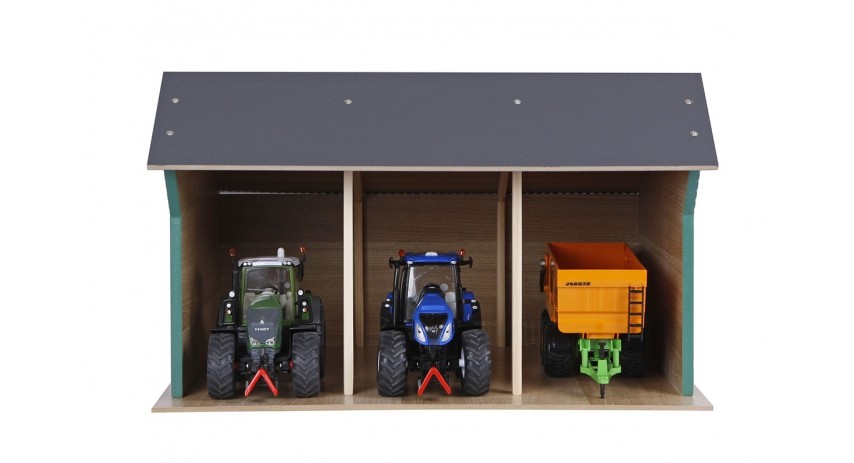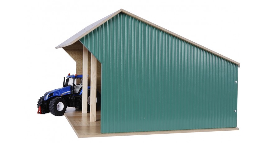 Featuring green corrugated side panels, a wooden base, and open-front tractor bays, this wooden farm building looks just like a real tractor shed found on a working farm. It’s built to fit all popular 1:32 farm toys, including Universal Hobbies, ERTL, and Siku models, making it a versatile and essential addition to any model farm collection.