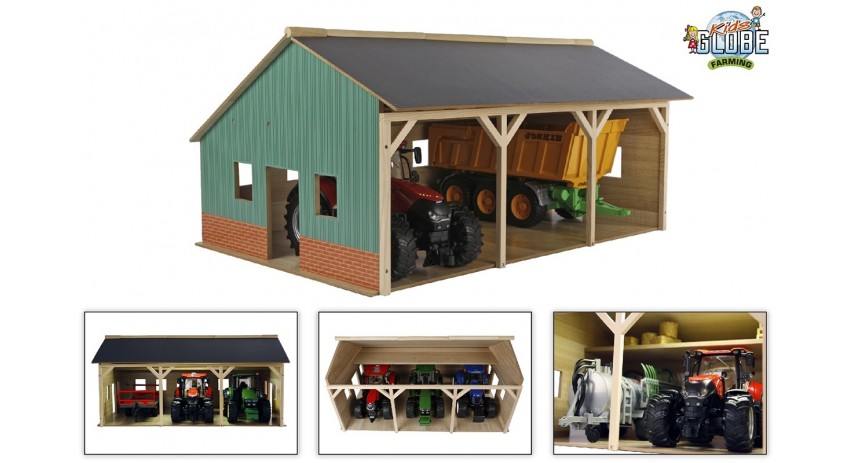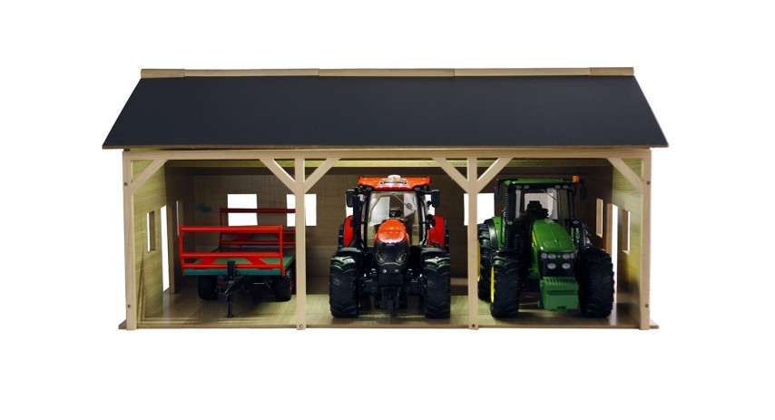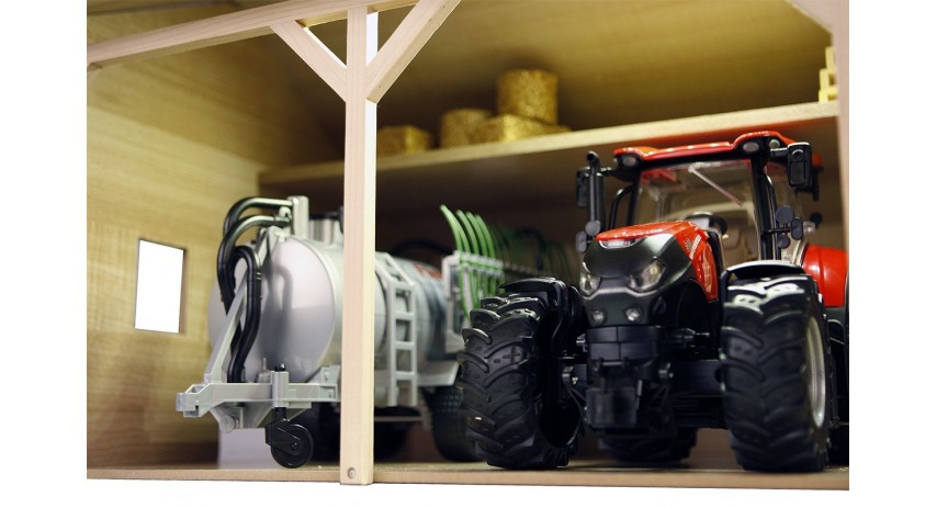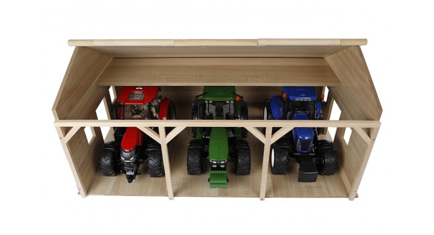 Bring farm life to your playroom with this 1:16 scale wooden farm shed toy, designed to fit up to 3 tractors or trucks and accessories. Made from durable wood with realistic details like open bays for easy access and a spacious hayloft. The half-folding roof makes it easy to play from the top. Perfect for storing toy tractors, trucks, trailers, and farm equipment, this shed encourages imaginative play and helps children develop coordination and storytelling skills. Compatible with popular 1:16 scale farm toys such as Bruder and Big Farm, this wooden shed makes a great addition to any young farmer’s collection or collector.