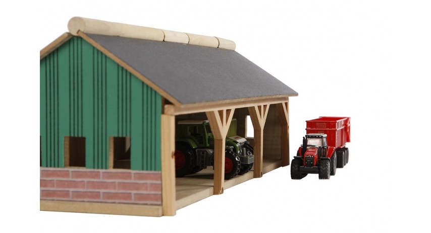 Bring realism to your 1:87 scale farm collection with this wooden farm machinery shed, designed for collectors and farm diorama enthusiasts. This detailed farm building features three open bays, providing space to store and display 3 die-cast tractors or trailers and accessories. The combination of natural wood framing, green panel-style walls, and a brick-pattern base creates an authentic countryside appearance. The open design by lifting up the roof provides easy access to place tractors and accessories inside the building. Durable and well-crafted in wood material, this farm shed is an essential addition for completing any 1:87 scale farm setup.